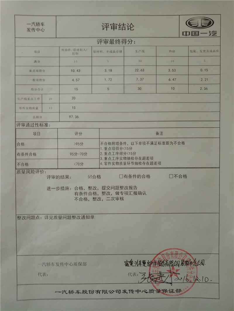 A级供应商审核报告-一汽轿车